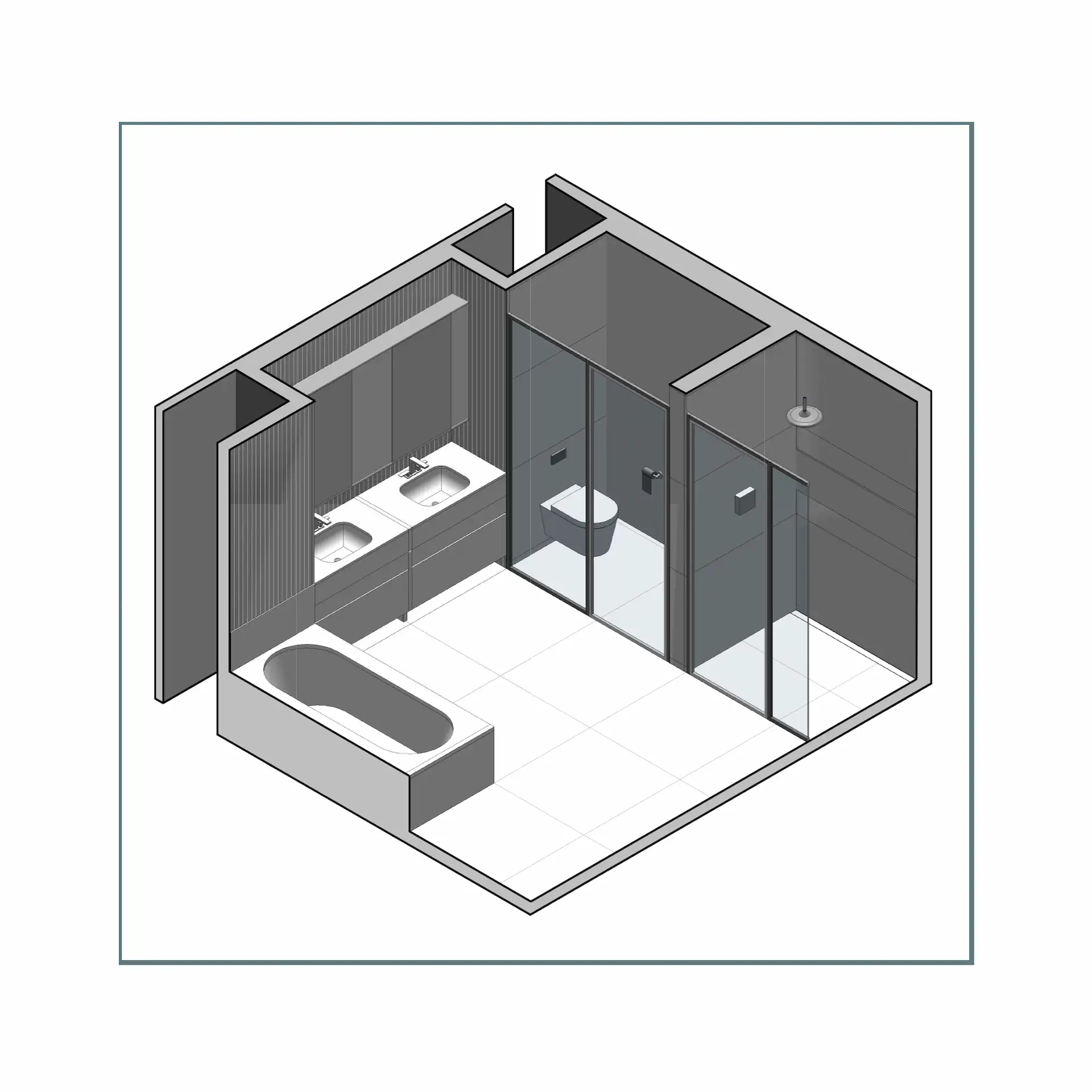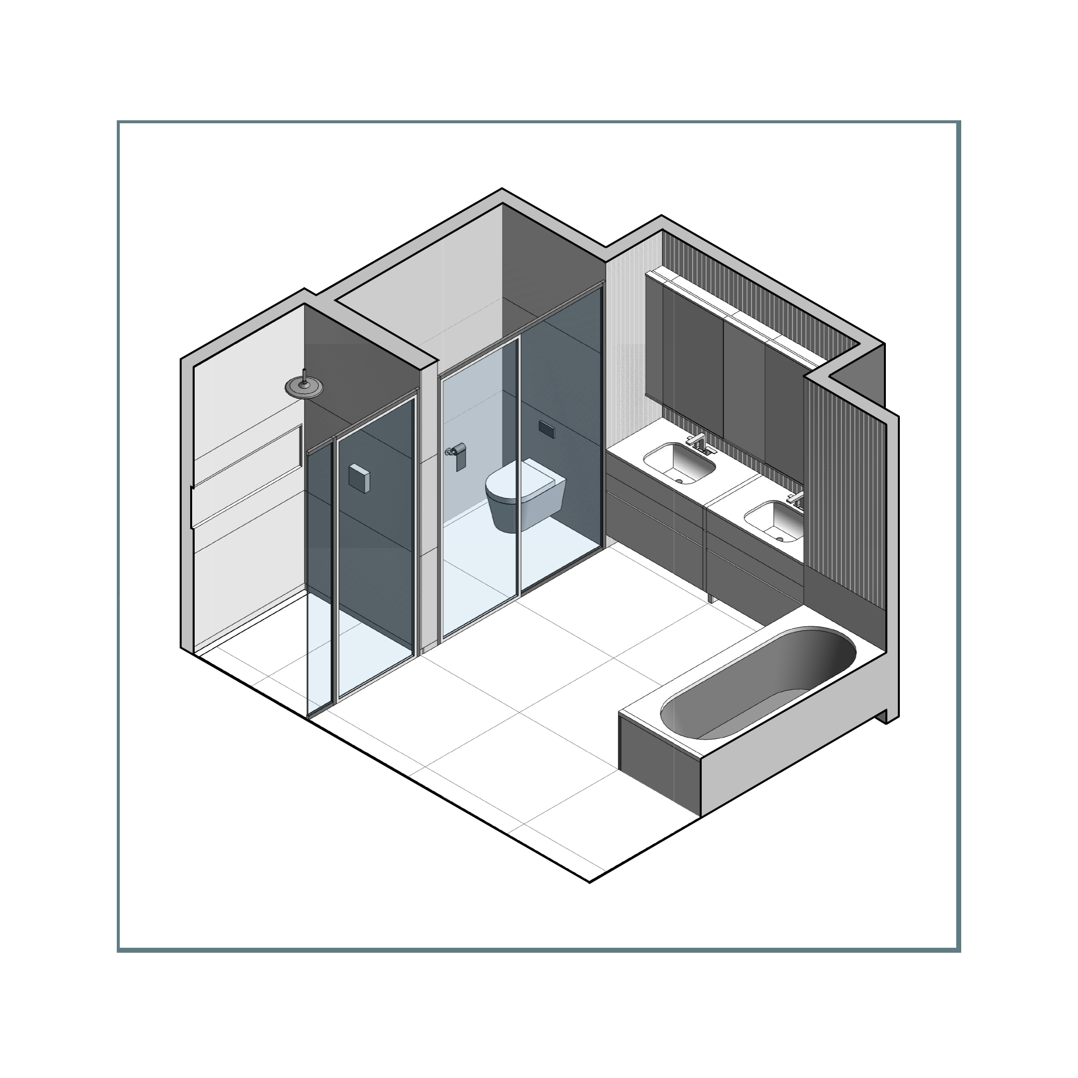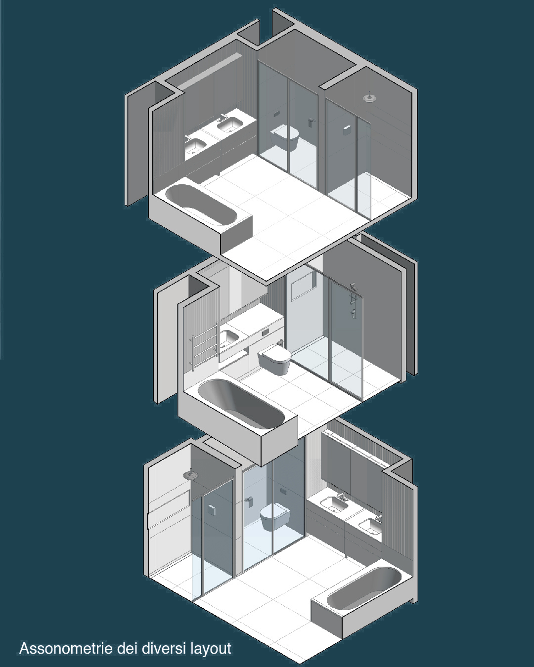 Sviluppo di diverse tipologie di bagni negli appartamenti, curando aspetti tecnici, impiantistici, costruttivi ed estetici.