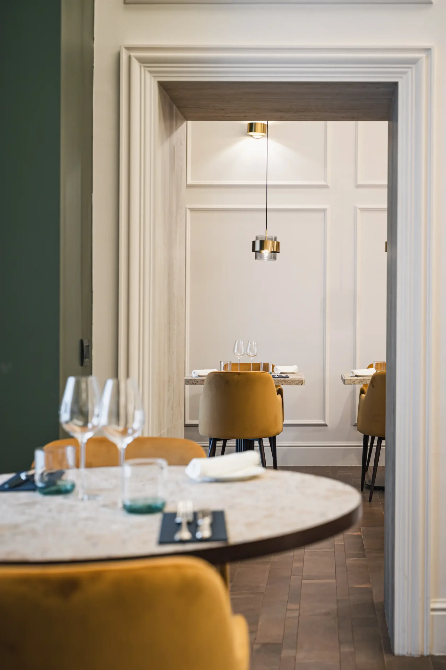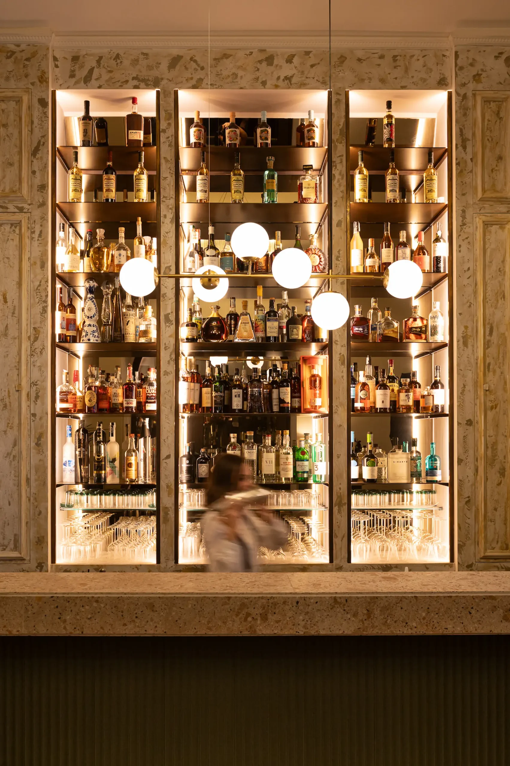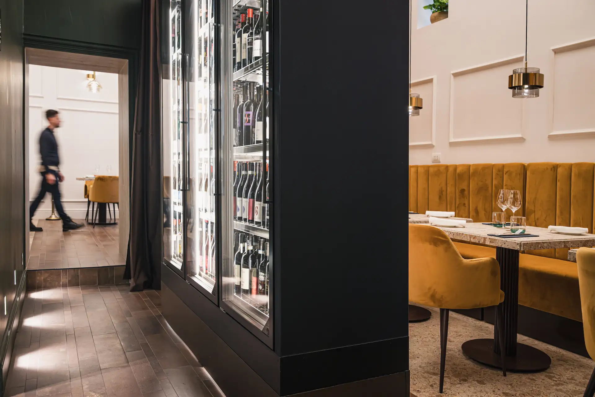In parallelo, l’identità contemporanea emerge nella chiarezza del layout, nella funzionalità dei flussi e nella ricerca di un’estetica essenziale. L’ingresso è il fulcro visivo: una porta monolitica in vetro conduce alla zona cocktail bar, progettata per mantenere continuità percettiva (cassa laterale, bancone compatto e attrezzato, retro-bancone ridotto con espositore scenografico). A destra, un grande arco porta ai servizi e a una seconda sala; i bagni includono un wc accessibile e un soppalco tecnico ospita parte degli impianti. Una vineria bifacciale segna il passaggio alla prima sala, più calda e avvolgente, pensata per capienza e flessibilità (panca continua e tavoli). Il percorso centrale, sottolineato dalla pavimentazione in asse, crea un effetto “cannocchiale” verso le sale successive: Sala 3 e Sala 4 sono le più ampie e valorizzate dal doppio affaccio sulla strada e sulla corte interna. La corte è l’ultima tappa: una piccola oasi urbana con fontana, verde e vista sulle aree operative (cucina, lavaggio, laboratorio), a sottolineare funzionalità e trasparenza. Al piano interrato trovano spazio una cantina visitabile per vini e distillati, oltre a magazzini e spogliatoi. L’intervento valorizza il patrimonio esistente migliorando anche prestazioni energetiche e impiantistiche dell’edificio.