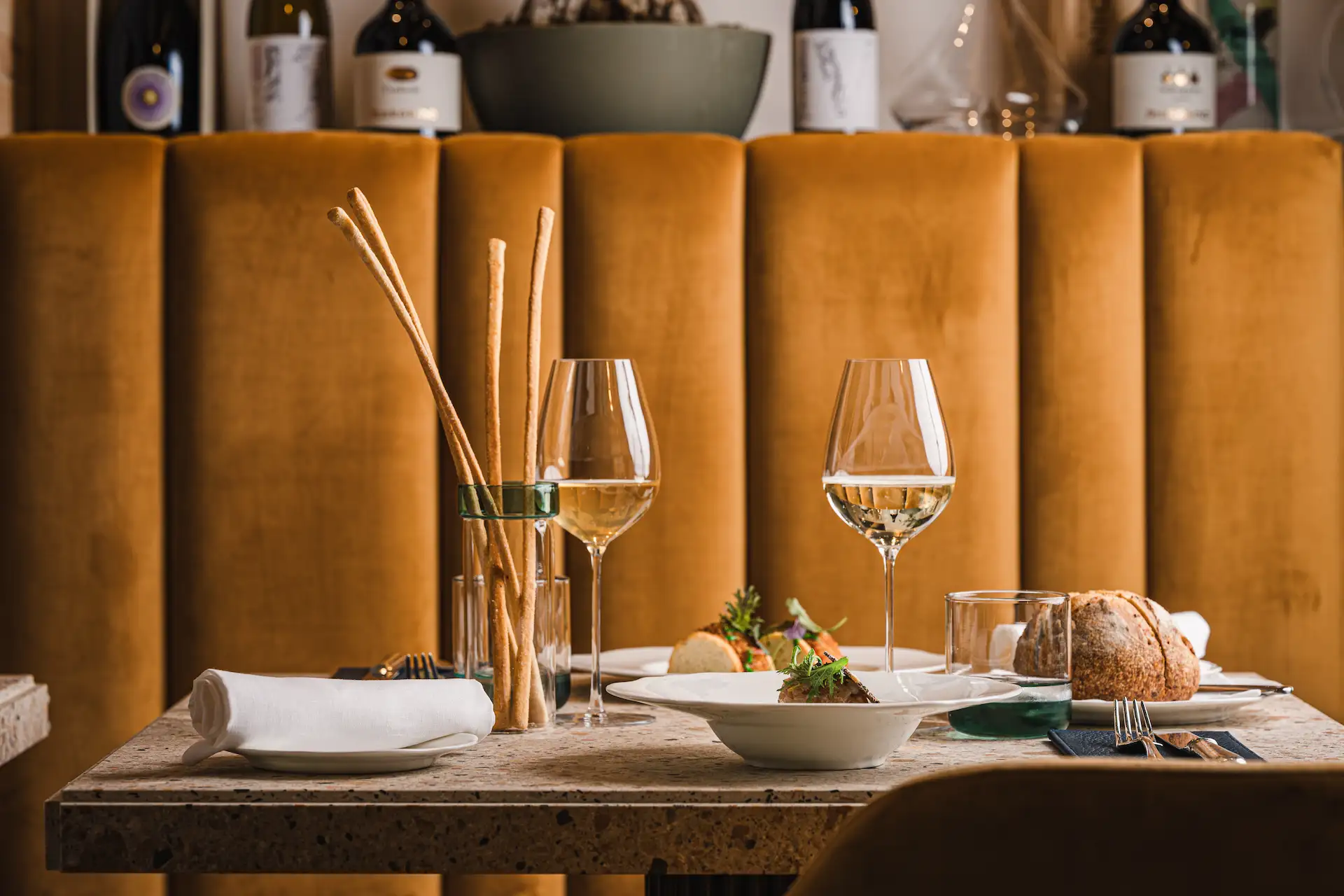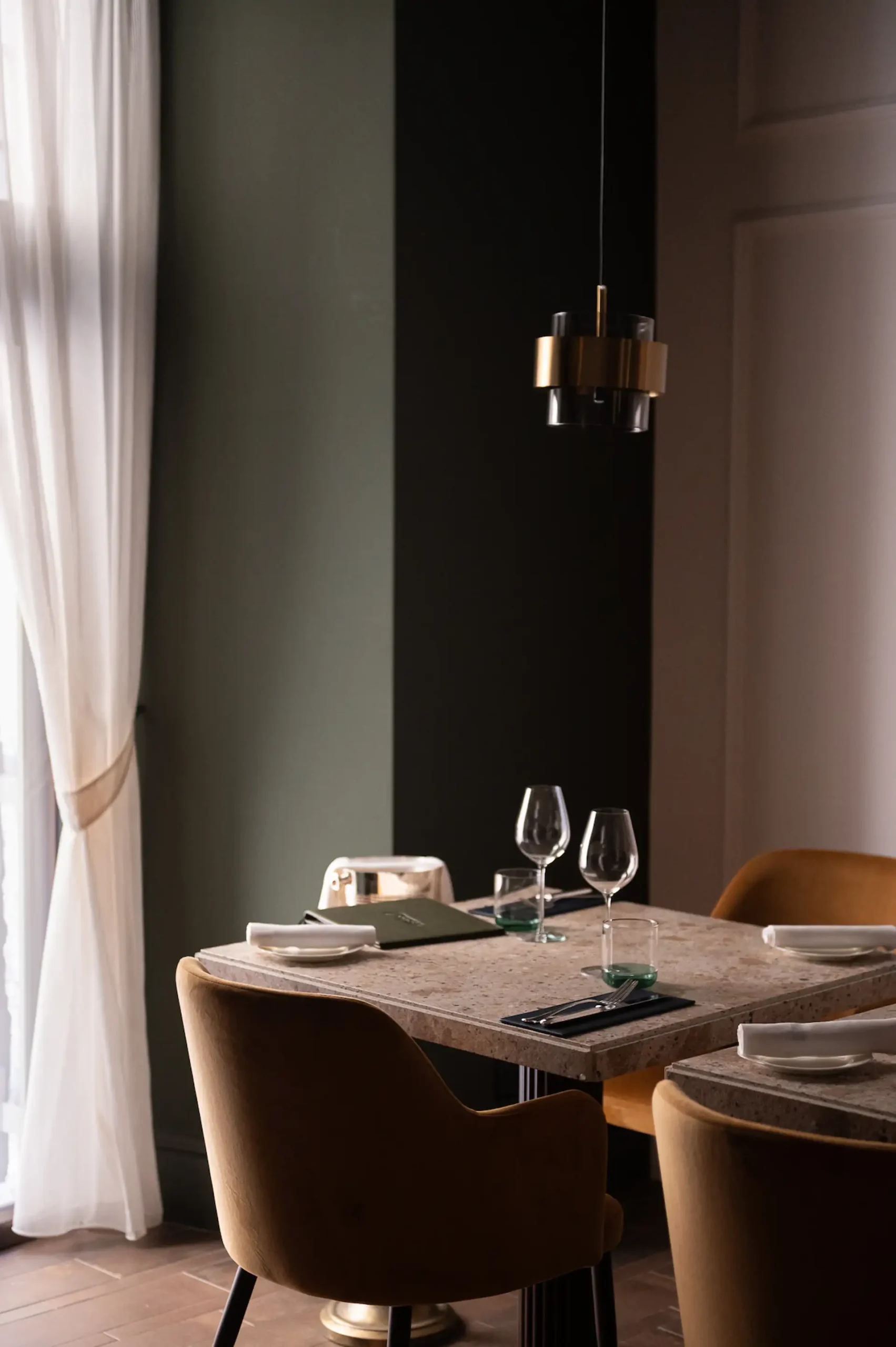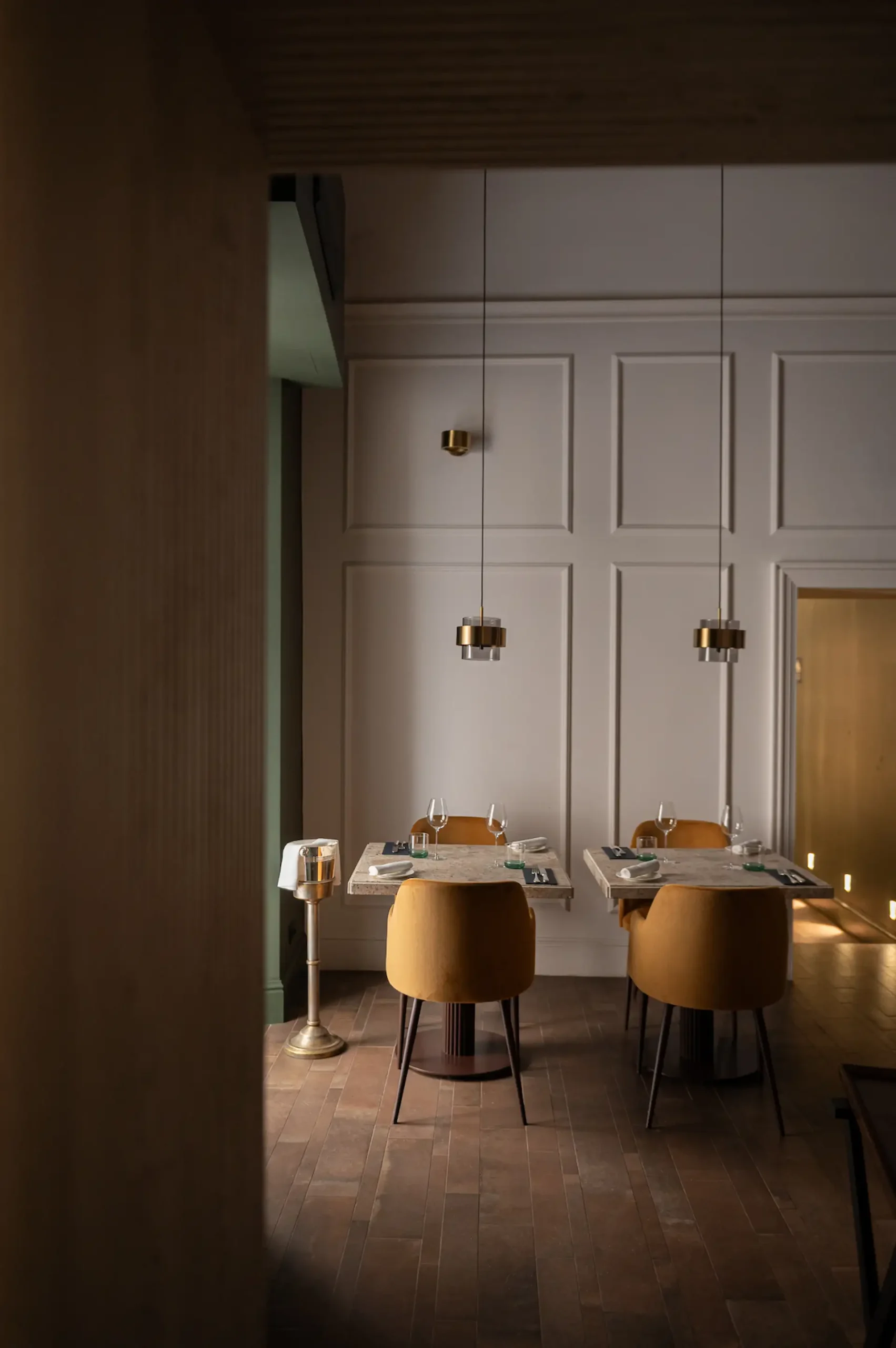 In parallelo, l’identità contemporanea emerge nella chiarezza del layout, nella funzionalità dei flussi e nella ricerca di un’estetica essenziale. L’ingresso è il fulcro visivo: una porta monolitica in vetro conduce alla zona cocktail bar, progettata per mantenere continuità percettiva (cassa laterale, bancone compatto e attrezzato, retro-bancone ridotto con espositore scenografico). A destra, un grande arco porta ai servizi e a una seconda sala; i bagni includono un wc accessibile e un soppalco tecnico ospita parte degli impianti. Una vineria bifacciale segna il passaggio alla prima sala, più calda e avvolgente, pensata per capienza e flessibilità (panca continua e tavoli). Il percorso centrale, sottolineato dalla pavimentazione in asse, crea un effetto “cannocchiale” verso le sale successive: Sala 3 e Sala 4 sono le più ampie e valorizzate dal doppio affaccio sulla strada e sulla corte interna. La corte è l’ultima tappa: una piccola oasi urbana con fontana, verde e vista sulle aree operative (cucina, lavaggio, laboratorio), a sottolineare funzionalità e trasparenza. Al piano interrato trovano spazio una cantina visitabile per vini e distillati, oltre a magazzini e spogliatoi. L’intervento valorizza il patrimonio esistente migliorando anche prestazioni energetiche e impiantistiche dell’edificio.