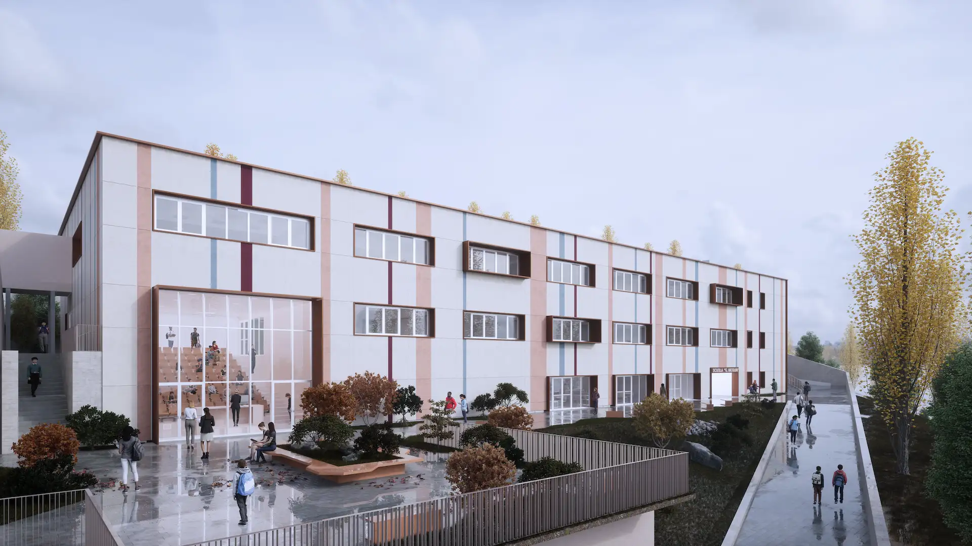 Il progetto riguarda la riqualificazione straordinaria della scuola “G. Nicolini”, riequilibrando spazi liberi ed edificati e migliorando la fruibilità per gli studenti nel rispetto delle normative. Il nuovo complesso ospita 13 classi e 10 laboratori, con spazi didattici e sportivi moderni, polifunzionali, tecnologici e aperti anche alla città, puntando su luoghi che favoriscano interdisciplinarità, inclusione, continuità tra dentro e fuori, accessibilità e un apprendimento più informale e collaborativo.L’organizzazione interna è pensata per garantire percorsi chiari e sicuri, con ambienti flessibili che possono adattarsi a diverse configurazioni d’uso durante la giornata scolastica.