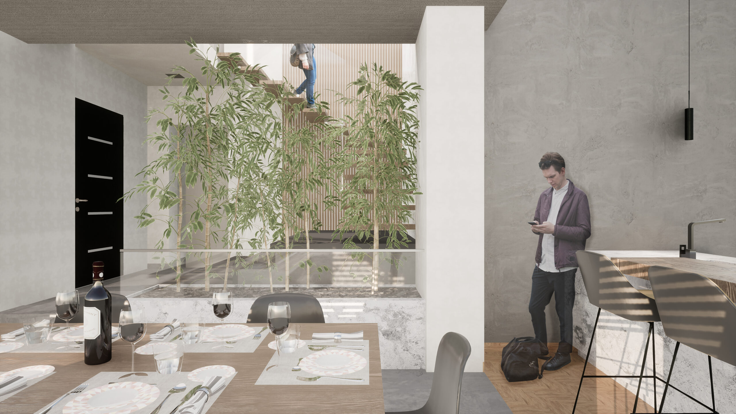 Orientata a Sud-Ovest, si compone di due volumi che si innestano nel terreno: il primo, più arretrato, dispone della zona notte e spazi di servizio – garage, lavanderia e locali tecnici – l’altro, più esposto, ospita la zona giorno, ampiamente illuminata da numerose bucature. Un corpo trasversale collega i due volumi, ingloba l’ingresso semi-nascosto e si slancia con uno sbalzo verso Sud, a fungere da finestra panoramica sulla valle. I terrazzamenti, così come i tetti piani, offrono una serie di “palcoscenici” dai quali poter osservare il paesaggio e godere della presenza prorompente della vegetazione circostante. Alle pareti opache si contrappongono tagli di luce che illuminano l’ambiente interno, offrendo anche molteplici angoli di visuale verso l’esterno, tali da congiungere, ancora una volta, la natura alla casa. Anche la scelta dei materiali è coerente con l’idea che ha accompagnato il concept di progetto: sostenibilità come sintesi tra modernità e tradizione del luogo. Largo uso di cemento e vetro si mescolano alla pietra e al legno, garantendo alti standard prestazionali agli ambienti interni mentre il landscape è lasciato quanto più possibile al naturale, con tappeti verdi che assecondano l’andamento altimetrico. L’elemento che ha fatto da linea guida per l’intero processo progettuale è certamente il rapporto tra la casa e la natura, ma anche l’unione tra comfort e rispetto dell’ambiente, tra un linguaggio vernacolare e uno che punta all’innovazione.