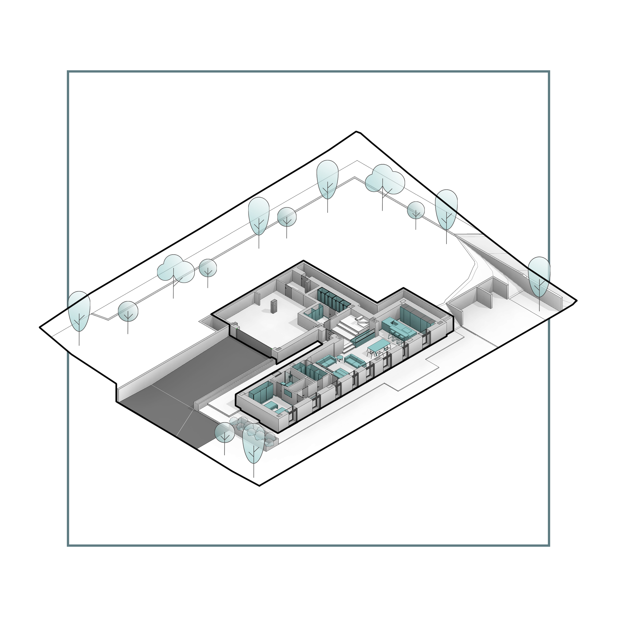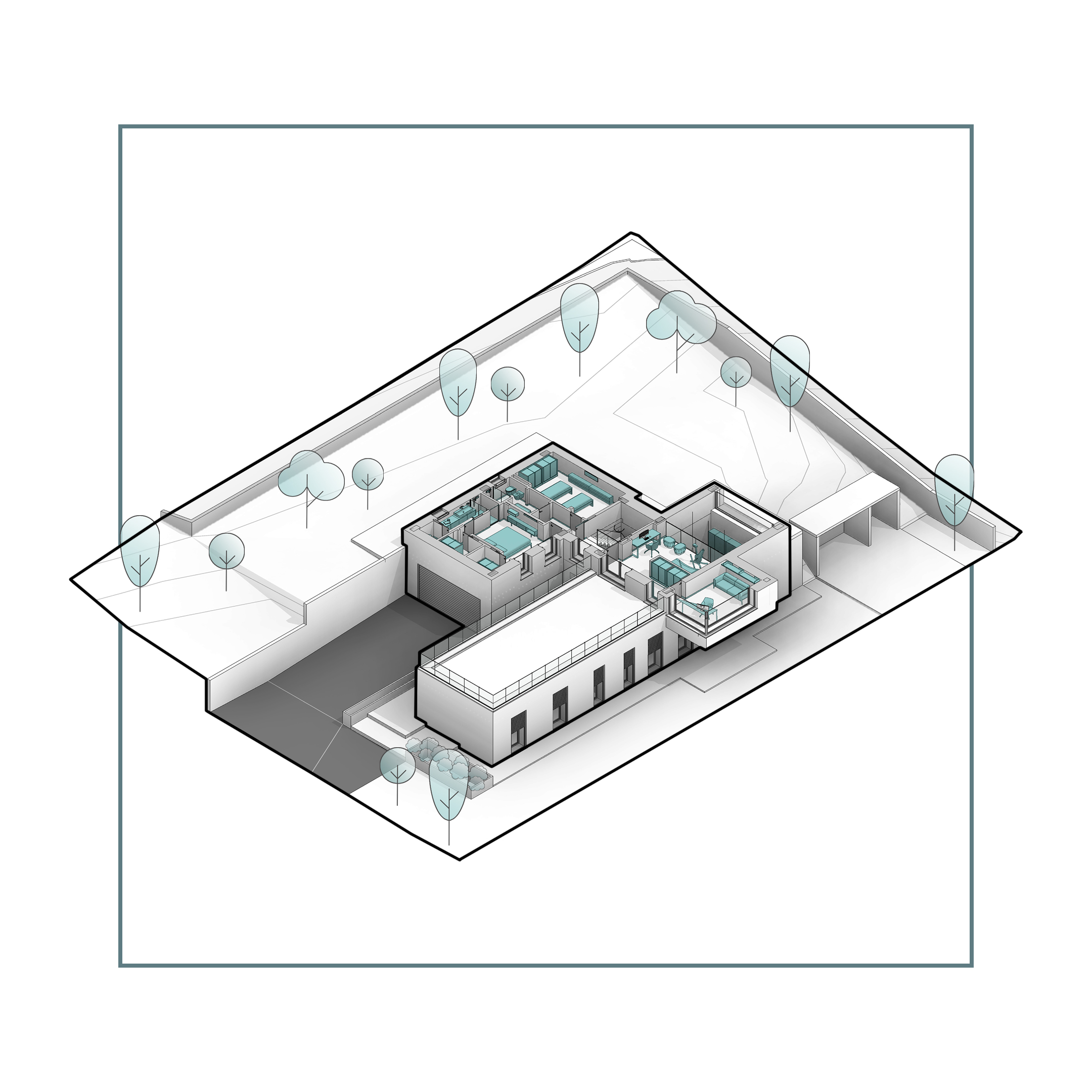 Il terreno, caratterizzato da un forte dislivello altimetrico, diventa parte attiva del progetto e guida l’impostazione volumetrica e funzionale.